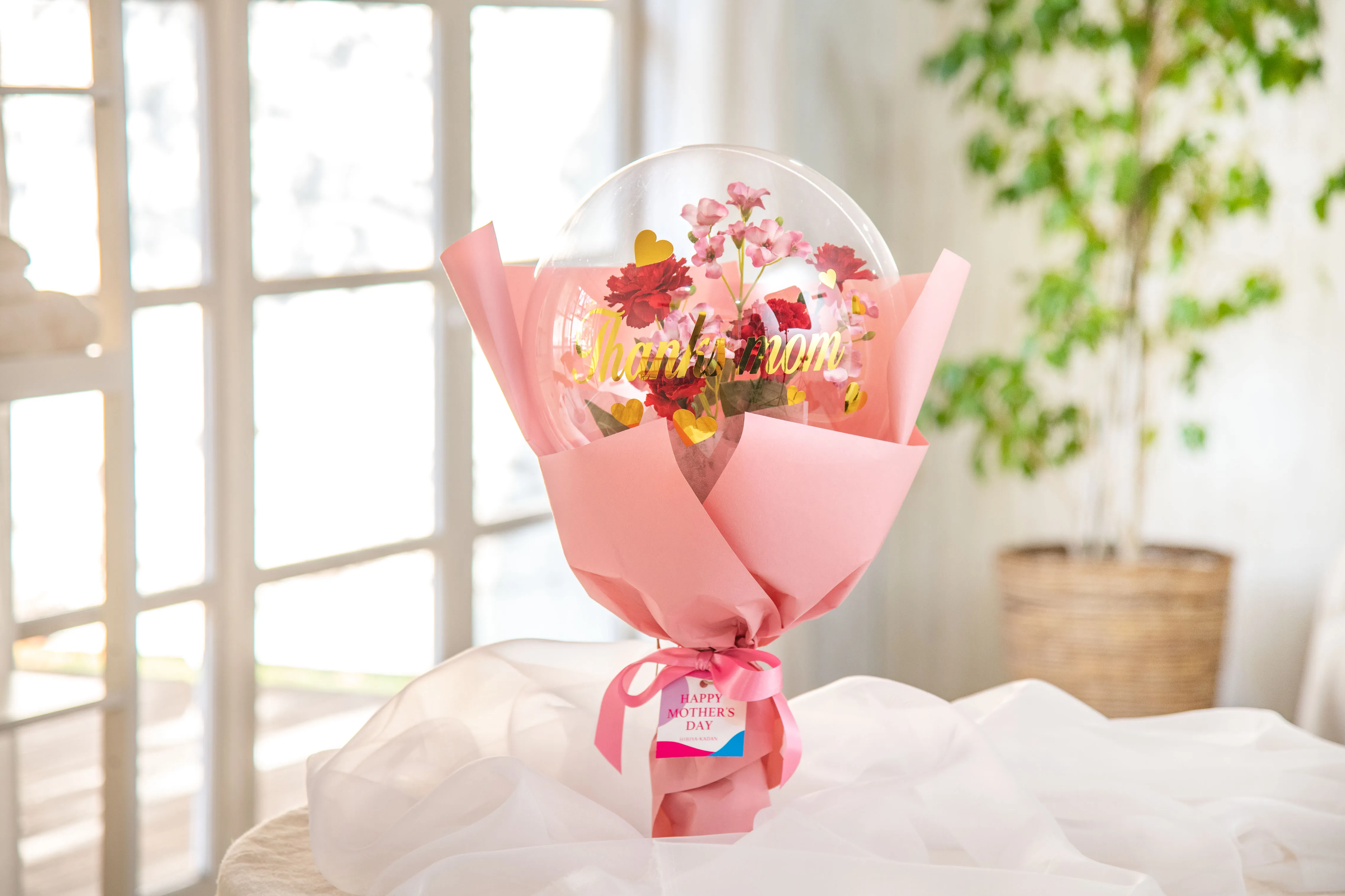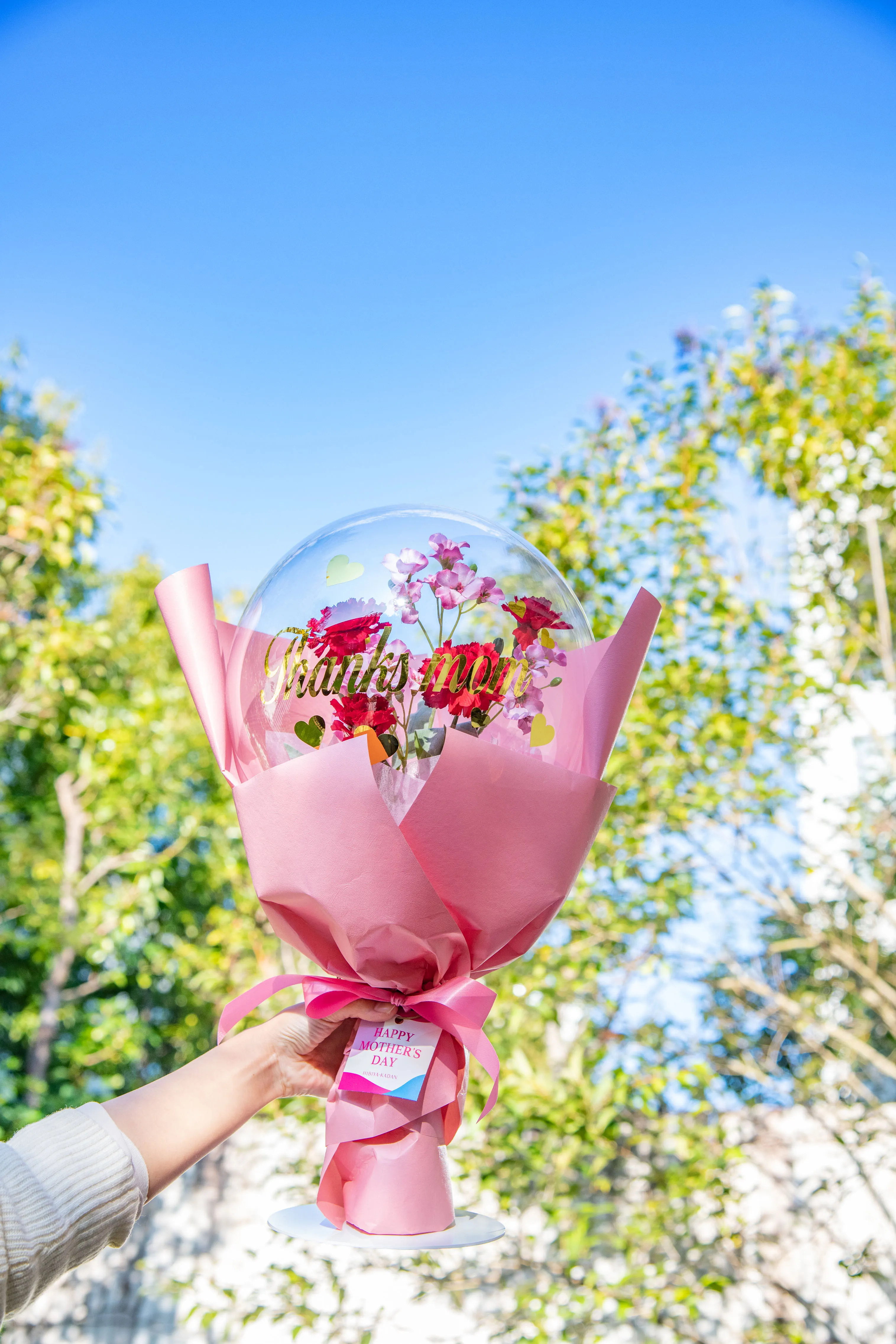 株式会社日比谷花壇(本社:東京都港区、代表取締役社長:宮嶋浩彰)は、5月の第2日曜日の母の日(今年は5月8日(日))に向け、新商品、メッセージ入りアクアバルーンフラワーブーケ「サンクスマム」(7,920円(税込・送料別))を数量限定で2月14日(月)から、日比谷花壇オンラインショッピングサイト(https://www.hibiyakadan.com)で注文受付を開始しました。