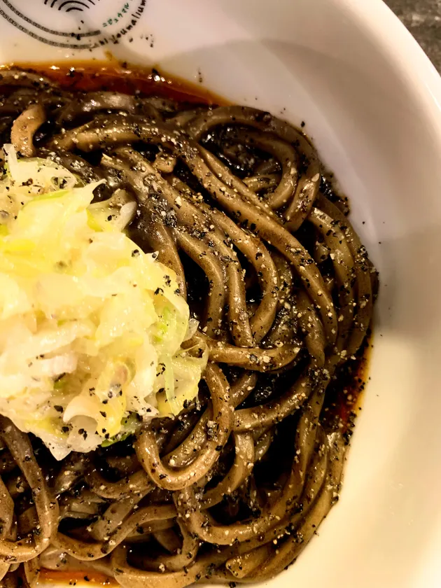麺を黒く染めるモノの正体は、自家製の黒ニンニクと黒胡麻ペースト