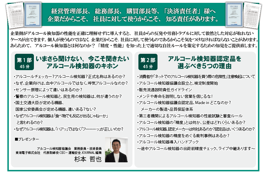 ■詳細はこちらから:いまさら聞けない、今こそ聞きたい『アルコール検知器のキホン』セミナー