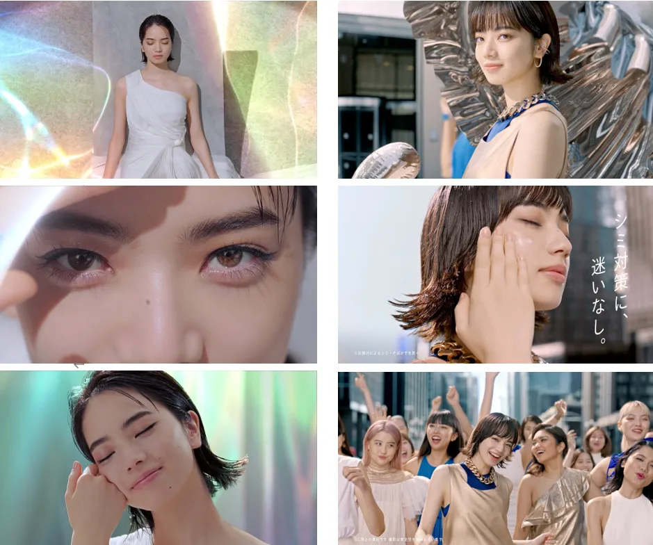 「アネッサ デイセラム」新CM「はじめよう、太陽エステ。」篇では、まばゆく光が差し込む幻想的な空間でベッドに寝そべった小松さんが登場します。「アネッサ デイセラム」の“紫外線をカットするだけでなく、同時に美容効果のある光に変換する”という革新的な技術で太陽を味方につける様子が表現されています。新商品のデイセラムの登場感と「はじめよう、太陽エステ。」という小松さんの呼びかけが印象的に描かれています。また、「シミ対策に、迷いなし。」篇では、都会のランウェイを舞台に、人々が太陽のもと、自信を持って輝いている姿を描いています。「アネッサ パーフェクトUV スキンケアジェル N」、「アネッサ ブライトニングUV ジェル N(医薬部外品)」を使うことで、自信に溢れた毎日を過ごしてほしいという願いを込めて作成しています。
