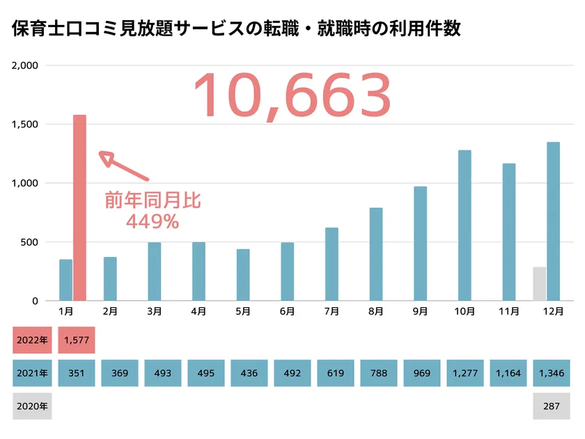 保育業界最多422,328件掲載の保育士・幼稚園教諭による保育園職場口コミサイト『保育士のミカタ』は、約1年前(2020年12月下旬)にサービスを開始した転職・就職活動中の保育士・幼稚園教諭向けの『保育士職場口コミと保育園職場ランキングのダブル見放題サービス』の累計利用件数が10,663件(2022年1月31日時点)となり1万件を突破いたしました。また前月2022年1月度には、サービス開始後最多となるの1,577件(前年同月比449%)月間利用件数を記録いたしましたので、お知らせいたします。