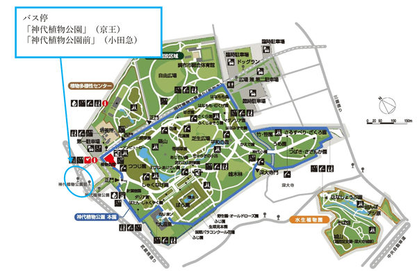 ・調布駅から小田急バス吉祥寺駅または三鷹駅行き「神代植物公園前」下車または京王バス深大寺行き「神代植物公園」下車
