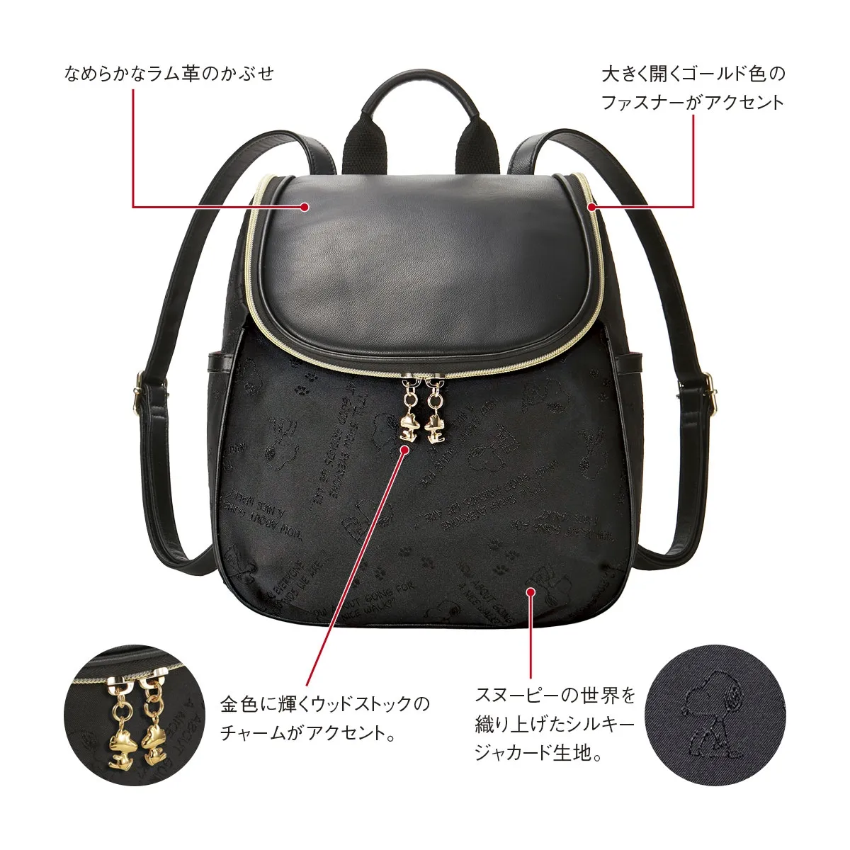 リュック本体にはスヌーピーのイラストや名言が浮かび上がるシルキージャカード生地を使用。