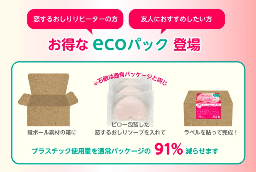 累計出荷555万個(集計:2016年3月~2021年1月)を突破した『恋するおしり』は2016年の発売から数多くのお客様に支えられてまいりました。この度、発売するエコパックはピロー包装した石鹸を段ボール素材の箱に入れることで通常パッケージに比べ、プラスチック使用量を91%削減*します。*当社比、重量比