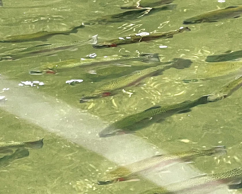 鮭がのびのびと泳げる宍粟の清流を引き込んだ養殖地で、ニジマスを品種改良した“ドナルドソン”という品種を稚魚から飼育し、成魚から卵を採りふ化させて、3年育てた成魚を出荷しています。