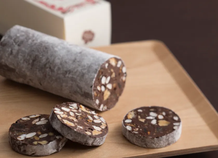 ベルギー産のチョコレートに、自家農園で栽培した岐阜県特産の堂上蜂屋柿の干柿・はつしも米の米はぜ・くるみ・いちじく・ゆずのドライフルーツを合わせ、和洋の文化の調和を愉しむサラミに見立てました。