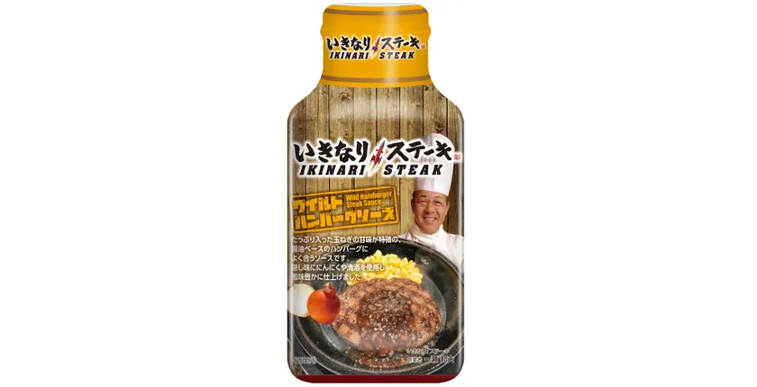 好評発売中の「いきなり!ステーキ いきなり!オニオンソース」を新規リニューアル。いきなり!ステーキの人気メニューである「ワイルドハンバーグ」で使用しているソースを再現した味わいです。たっぷり入った玉ねぎの甘味が特徴の醤油ベースのハンバーグソースで、からあげや野菜炒めなどにもお使いいただけます。