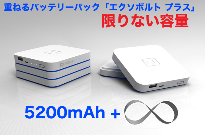 重ねるバッテリーパック「エクソボルト プラス」は、レゴのようにメインバッテリーにサブバッテリーを積み重ねることで無限にバッテリー容量を拡張できるモバイル充電器です。USBポート内臓。各ユニット5,200mAhの大容量。