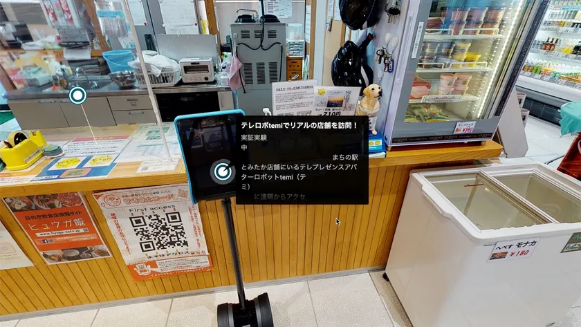 日向市駅に隣接したまちの駅とみたか物産館館内のデジタルツイン空間を作成。空間内にはお土産や観光情報と共に、現地に設置されたテレロボへのアクセスポイントをタグ付けしています。遠隔からの訪問者は、デジタルツイン空間(バーチャル空間)で館内を見学するのと共に、空間内にタグ付けされたアクセスポイントをクリックすることで現地(リアル空間)にあるテレロボにテレポートが可能です。テレロボtemiで物産館内を自由に歩きまわりながら、現地のスタッフとのコミュニケーションやお買い物が可能となり、遠隔から“バーチャル空間とリアル空間の往来体験”を楽しめます。