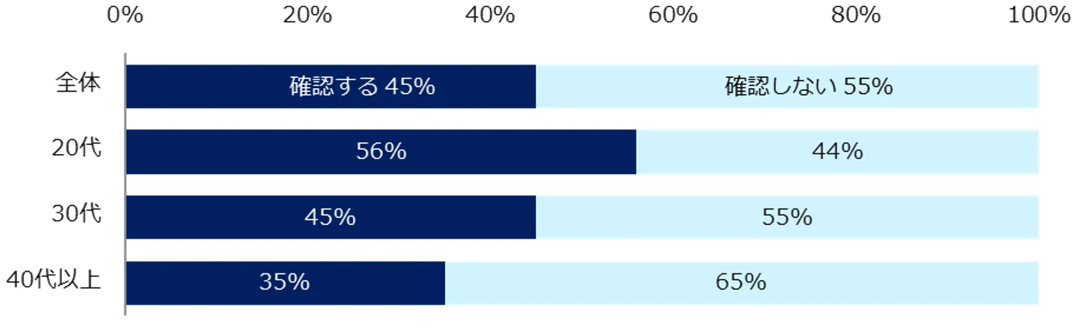 「転職するにあたって、事前に転職先の人間関係を確認しますか?」と伺ったところ、「確認する」と回答したのは45%でした。約9割の方が転職先での人間関係に不安を抱いている一方で、事前の情報収集を行なっている割合は半数未満にとどまっています。年代別では、20代が56%、30代が45%、40代が35%と、若い方ほど転職先の人間関係についての情報収集を行なっていることが分かりました。