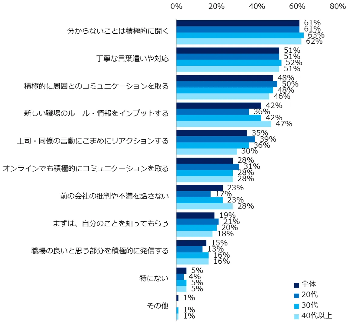 「コロナ禍において、職場の人間関係を構築するために必要なことは何だと思いますか?」と伺ったところ、上位は「分からないことは積極的に聞く」(61%)、「丁寧な言葉遣いや対応」(51%)、「積極的に周囲とのコミュニケーションを取る」(48%)でした。「雑談をしにくい環境なので、業務内容について話しかける機会を増やす」などのコメントが寄せられ、コロナ禍で減少したコミュニケーションの機会を、業務の中で確保しようとしている様子がうかがえます。具体的なエピソードも紹介します。