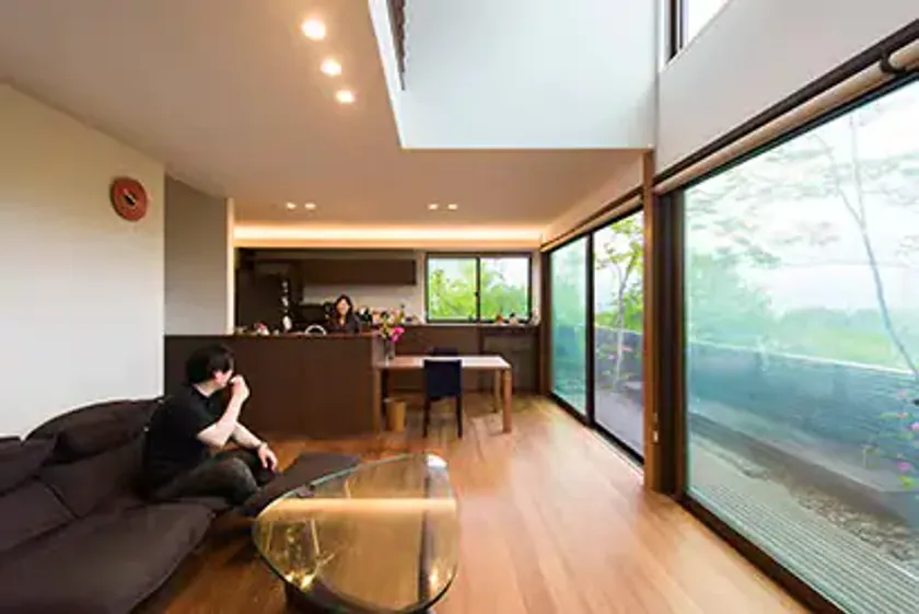 庭木だけでなく公園や山並みを借景にした緑あふれるリビング