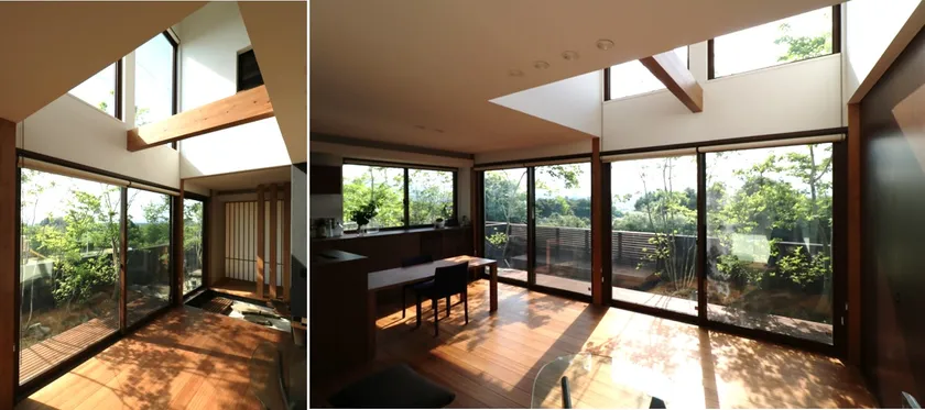 大きな窓と吹き抜けにより、どこを見ても緑がいっぱい