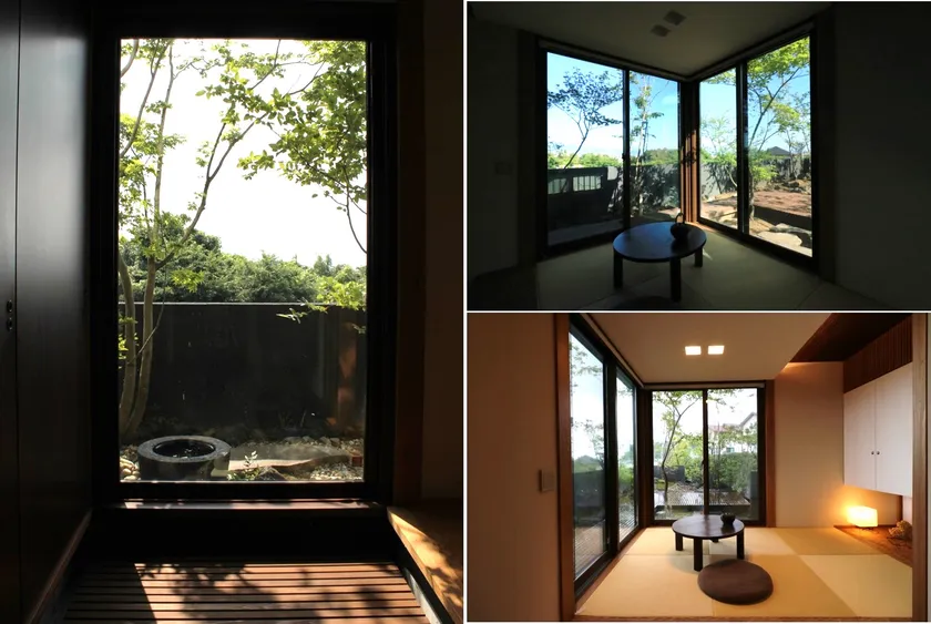 左・中:庭に設置した水鉢にはシジュウカラがやって来ることも 右上下:和室から見た庭