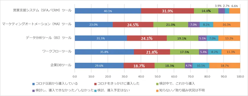 続いて、営業DXの核となる各種データの収集、構築、活用が可能なセールステックツールの導入状況について質問しました。「営業支援システム(SFA/CRM)ツール」では、「コロナをきっかけに導入した」が31.9%。「検討中で、これから導入」(14.8%)を加えると46.7%でした。「マーケティングオートメーション(MA)ツール」では、「コロナをきっかけに導入した」(24.5%)、「検討中で、これから導入」(21.0%)で合わせると45.5%。その他、「コロナをきかっけに導入した」各種ツールの回答は、「データ分析(BI)ツール」で24.1%、「ワークフローツール」で21.8%、「企業DBツール」では18.7%でした。オンライン商談やテレワークなど、3密回避のための取り組みはコロナをきっかけに70%以上の企業が導入しているだけではなく、積極的なセールステックの導入が進んでいるようです。