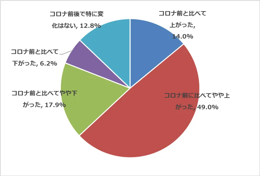 続けて、営業生産性の改革に取り組んだと回答した257名に対して「新型コロナウイルス感染症の流行をきっかけに取り組んだ営業生産性の改革を総合的に見て、成果はどのように感じていますか。」と聞いたところ「コロナ前と比べて上がった・やや上がった」が63.0%で、「下がった・やや下がった・コロナ前後で変化がない」と回答した企業は37.0%となりました。導入している企業のうち、約4割が総合的な成果を感じていないという意外な結果になりました。
