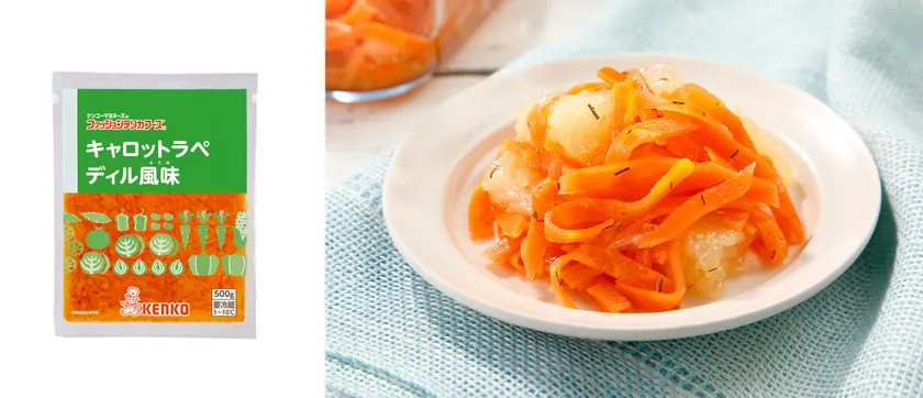 色鮮やかなにんじんにディルをあわせた爽やかな味で、りんご酢とはちみつでやわらかな甘味に仕上げました。細めの短冊切りにした国産にんじんのシャキシャキとした食感をお楽しみいただけます。