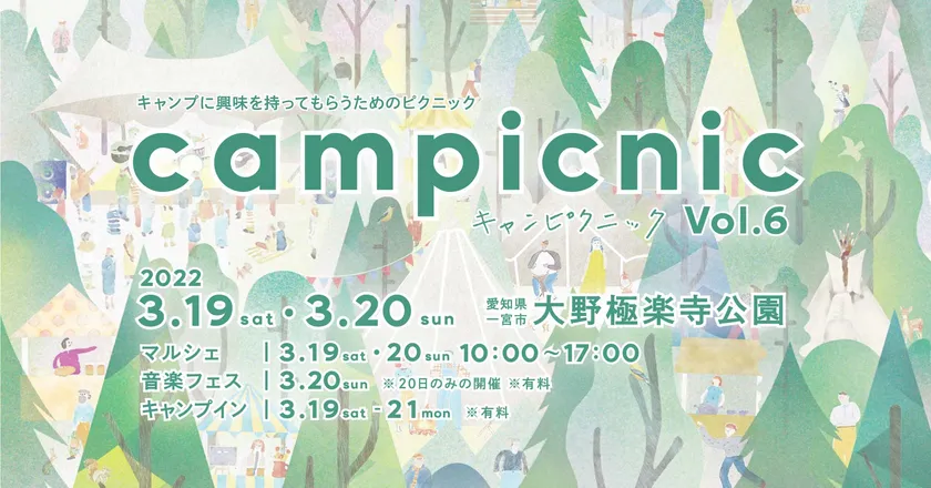 これまで新型コロナウイルスの影響を受け、幾度となく中止と延期を続けている「campicnic(キャンピクニック)」(運営:campicnic実行委員会)は、この度、2022年3月19日(土)・20日(日)の2日間、愛知県一宮市大野極楽寺公園で「campicnic Vol.6」を開催します。