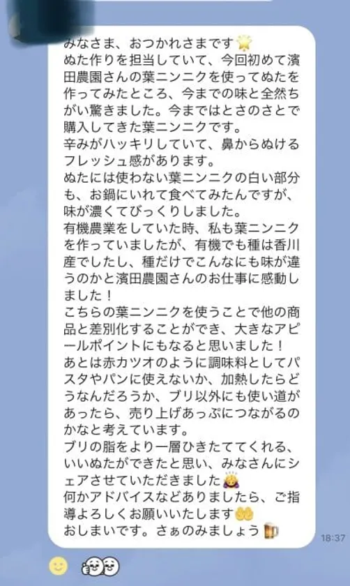 そのこだわりのにんにく葉の味は、辛みと甘み、濃厚な味が特徴で、まさに酒好きの高知という風土に適したもので、ぬたにもピッタリであると考えています。