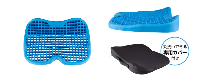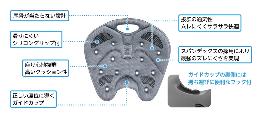 強度、柔軟性、耐熱性に優れた熱可塑性エラストマー(TPE)とシリコーン特性を持つポリマーの独自ブレンド技術により、安定性と弾力性を兼ね備えた長時間座ってもおしりが沈まないジェルシートが誕生しました。人間工学に基づく体圧分散構造がおしりにかかる負荷を70%もカット*、腰の負担、座り疲れを軽減します(*バックジョイ社調べ)。付属の専用カバーは丸洗いができ通気性が良く、取り外ししやすいチャック付です。