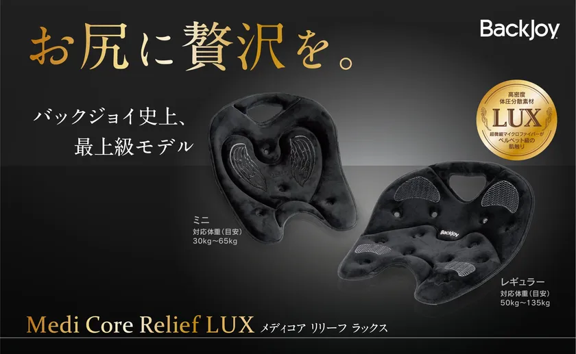 座るだけで姿勢を正して腰の負担を軽減する「バックジョイ」。ブランド最強のホールド感を誇る、メディコアシリーズのLUXは高級ベルベットのような滑らかな肌触りの超微細マイクロファイバーを贅沢に使用。高密度体圧分散素材の採用により、リリーフグリップの2倍のクッション性が極上の座り心地を約束します。