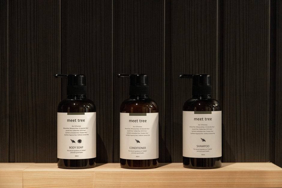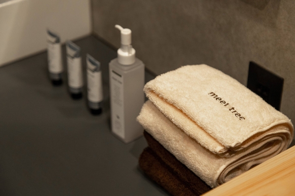アメニティとして、「meet tree」の商品であるシャンプー、コンディショナー、ボディソープ、ハンドクリーム3種、除菌ジェル、および岐阜県安八郡安八町にある浅野撚糸株式会社の「エアーかおる」とコラボしたオリジナルタオル、サウナハットをお使いいただけます。