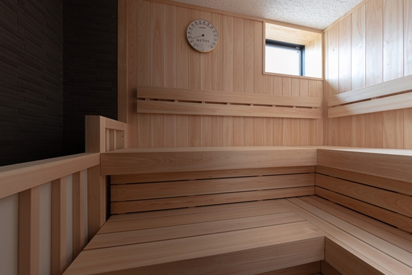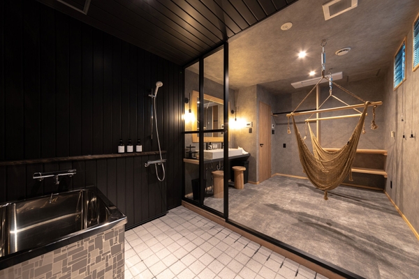 2階には、1名様用のサウナを1部屋、2名様用のサウナを1部屋ご用意しています。サウナに使用されている木材は自社グループ工場で製材したヒノキを使用。また、サウナ室ではヒノキ精油を使用したアロマウォーターのロウリュを楽しむことができ、フレッシュで爽やかな香りがする「ヒノキの葉」、重厚感がありウッディな香りがする「ヒノキの木」のどちらかをお選びいただけます。サウナの後は広々とした空間でハンモックに揺られながら“ととのう”体験をご堪能ください。