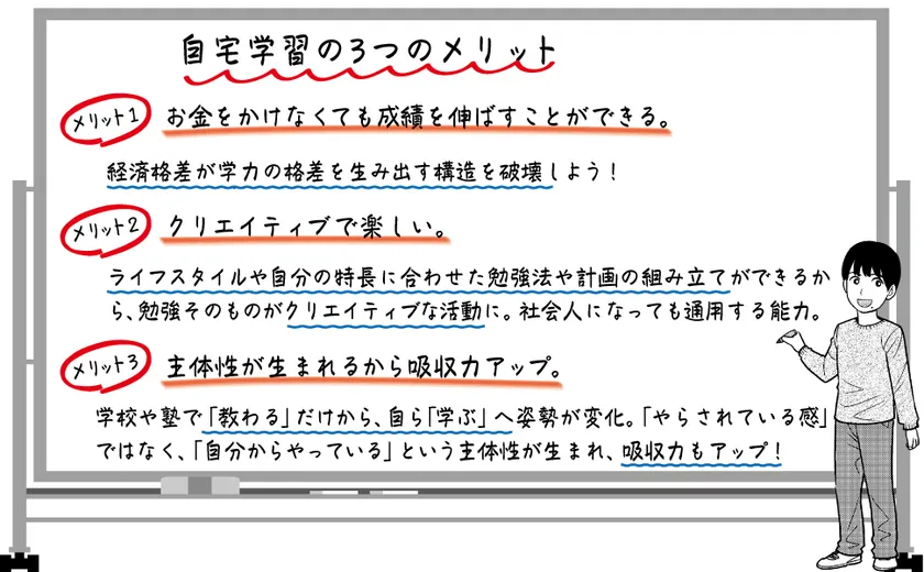 著者は自宅学習には次の3つの大きなメリットがあると語ります。