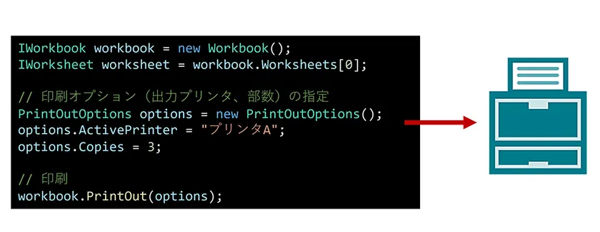 Windows環境で物理プリンタへの直接印刷をサポートします。コード上で出力するプリンタや部数の指定が可能です。