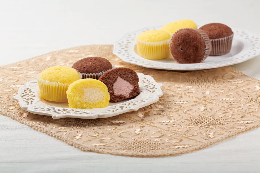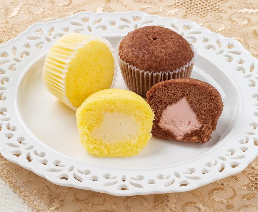 スチーマーで蒸しあげた“蒸しスフレ”に、カスタードクリームベースの軽いクリームを入れました。プレーン生地に、カスタードとホイップクリームを合わせた『カスタードホイップ』と、チョコレート生地に、苺クリームを合わせた『いちご&ショコラ』の2種類ご用意しました。