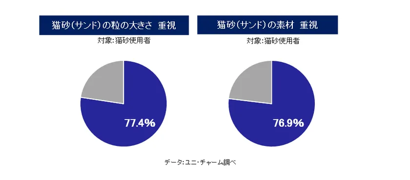 猫砂の使用者は、ネコちゃんが気持ちよく排泄できるよう、猫砂(サンド)の粒の大きさや、素材にこだわっています。また、猫砂市場の約7割は、紙や鉱物素材で構成※2されており、なかでも鉱物タイプの粒の大きさは小さい傾向にあります。
