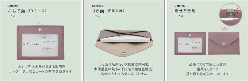 商品特徴 :IDカードと名刺を一緒に持ち歩くことができるケースです。