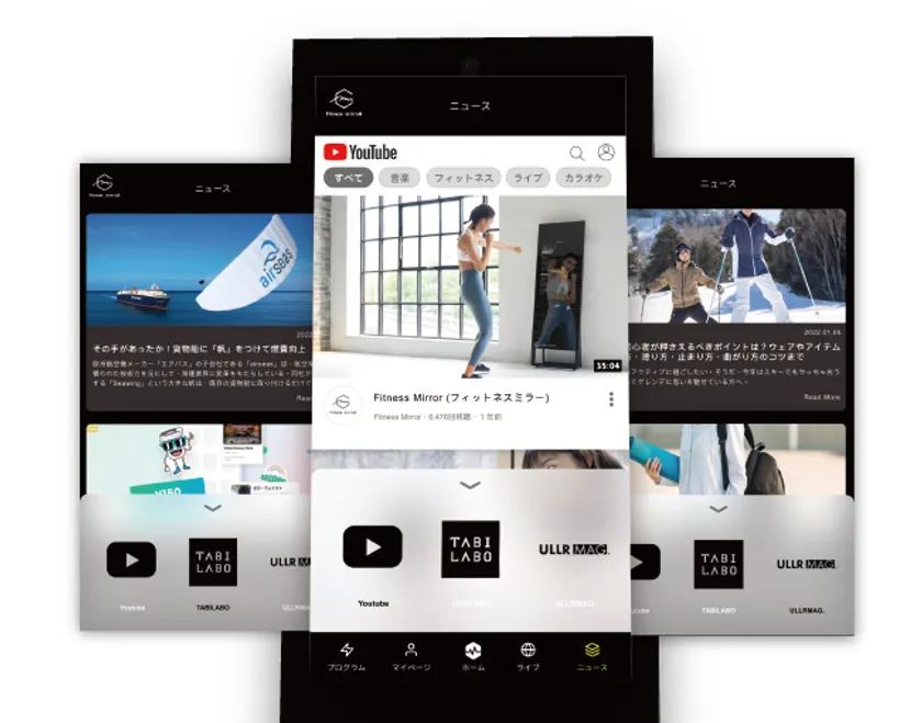 皆様が、より健康的に、ストレスなく、楽しく、充実した毎日を送るために、各メディアと連携し、ウェルネス関連情報やライフスタイル情報の発信を充実させていきます。さらに、「Fitness Mirror」大画面でYouTubeの動画もお楽しみいただけます。