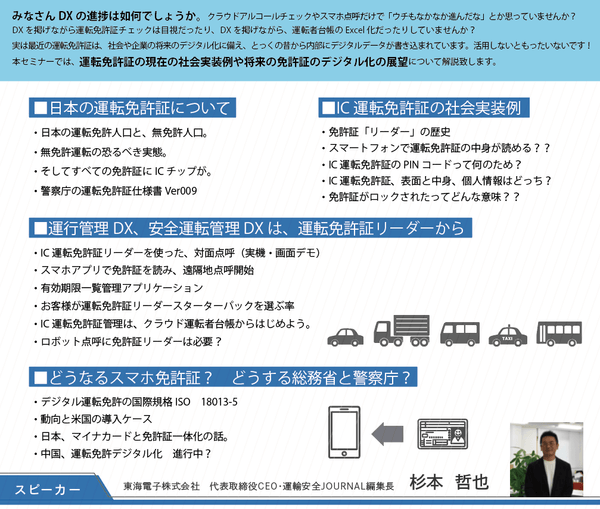 スピーカー:東海電子株式会社 代表取締役CEO・運輸安全JOURNAL編集長 杉本 哲也