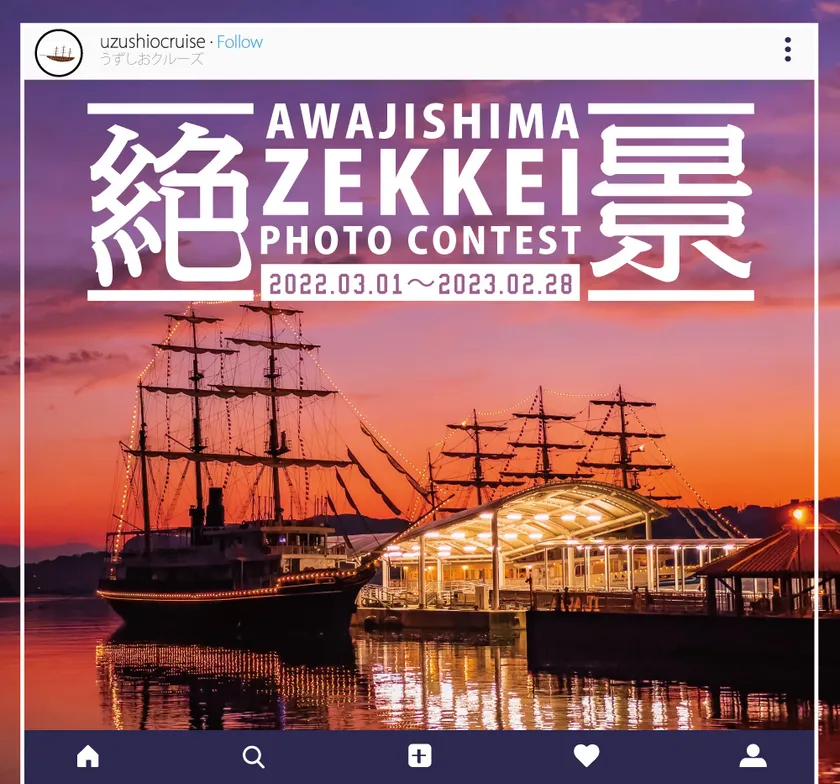 兵庫県・淡路島から出航している「うずしおクルーズ」と「明石海峡大橋クルーズ」を運営しているジョイポート南淡路株式会社(所在地:兵庫県南あわじ市福良、代表締役社長:鎌田 勝義)は、淡路島へ旅行に来ていただいたお客様を対象に、淡路島一の絶景を決める「淡路島絶景フォトコンテスト」を2022年3月1日(火)~2023年2月28日(火)に開催いたします。淡路島で撮影されたオリジナリティ溢れる絶景写真をハッシュタグ「#絶景淡路島2022」をつけてInstgramに投稿してください。毎月3作品の最終週候補作品を選出し、応募期間終了後の2023年3月から最優秀作品を選ぶ「淡路島絶景フォト最優秀作品選出展示会」を開催します。最優秀賞に選ばれた方には淡路島の海の幸「クボタ水産の極みセット」を贈呈、最優秀候補にノミネートされた方にはうずしおクルーズと明石海峡大橋クルーズの乗船券を贈呈いたします。