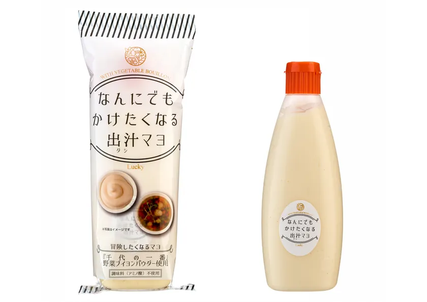 200gチューブの出汁のきいたマヨ「なんにでもかけたくなる出汁マヨ」は、調味料(アミノ酸)を使用していません。出汁は、「千代の一番」野菜ブイヨンパウダーを使用しています。(※海産物・農産物・加工食品製造販売メーカー「株式会社千代の一番」とのコラボ商品)。卵黄タイプのマヨに野菜の旨味で仕上げたブイヨンを合わせることで、旨味とコクがアップし後引く美味しさに仕上げました。