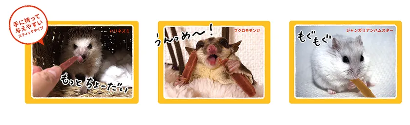 ★手にもって与えやすいスティックタイプ。ちょこっと与えやすいスティックタイプのジャーキーになります。与えやすいだけでなく、小さい体の子たちも、手に持って食べられるちょうどいいサイズで、ペットの可愛い姿も楽しめます。