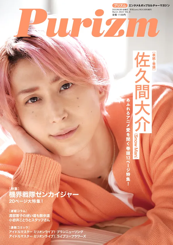 エンタメ&ポップカルチャーマガジン『Purizm』(プリズム)Vol.8の表紙をSnow Manの佐久間大介さんが飾ります。巻頭特集は、アニメ愛に溢れる佐久間さんのインタビューと撮り下ろし写真を収録した12ページ!子どもの頃のアニメとの出会いや、好きな作品とその魅力、ご自身がアニメから受けた影響などについて時間の許す限り語っていただきました。