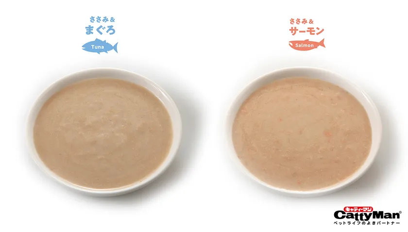 九州産の生乳を使用し、さらに猫ちゃん大好きな「ささみ」をベースにした「ささみ&まぐろ」と「ささみ&サーモン」の二つのバリエーション。