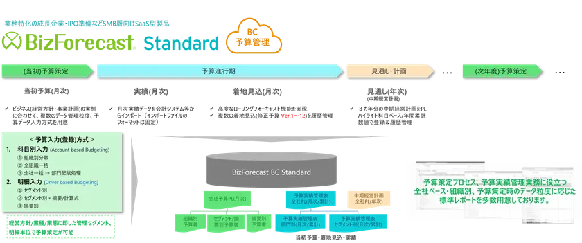 「BizForecast BC」は、主に成長企業・IPO準備企業などSMB層向けに提供する(マルチテナント)クラウドサービスです。勘定科目より細かい粒度による予算策定が可能であり、当初予算策定と進行期に入ってからの予算実績管理だけでなく、複数回の着地見込み(修正予算検討・シミュレーション)の策定および履歴管理、ローリングフォーキャストによる精度の高い予算管理を実現できます。