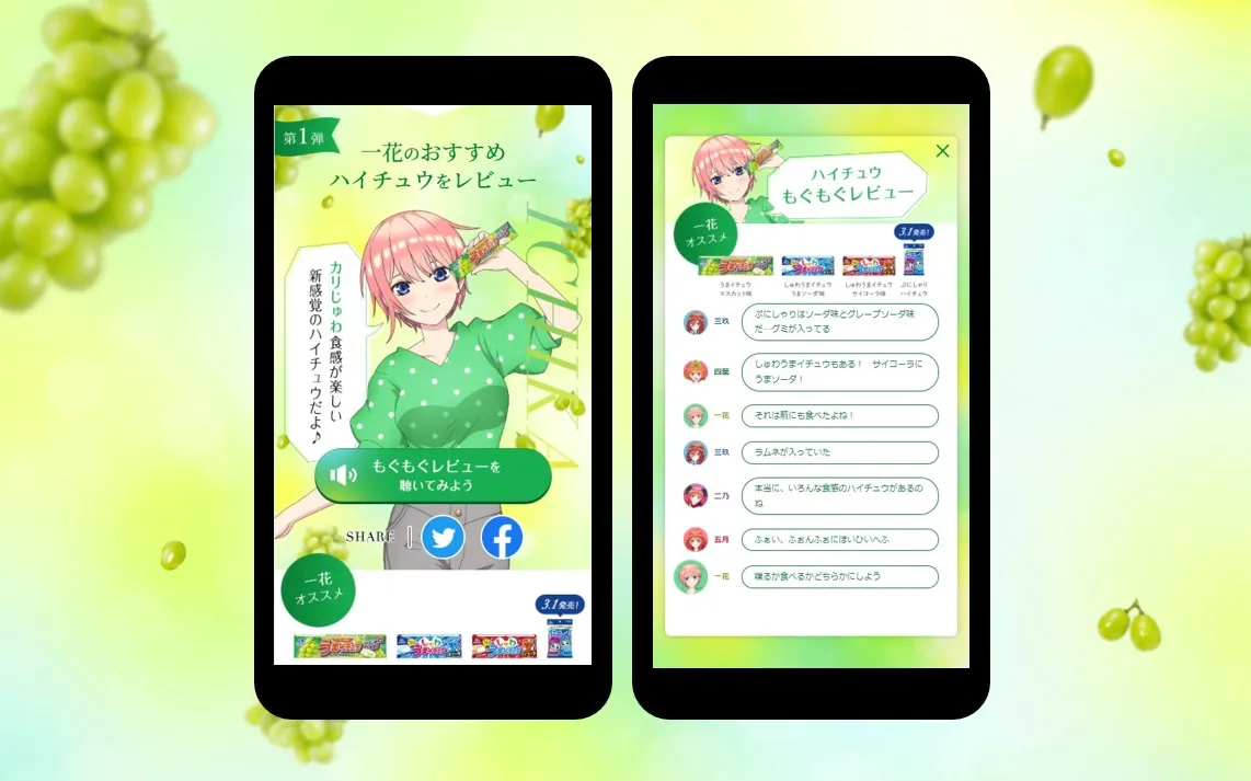 「ハイチュウ」と『五等分の花嫁」のコラボ第2弾(2021年10月5日~11月28日実施)でご好評いただいた、五つ子たちによる「ハイチュウもぐもぐレビュー」が今回も新ボイスで登場!五つ子たちが様々なハイチュウを食べ比べして、イチオシの商品をレビューとともにご紹介します。会話形式で語られるセリフは、「アニメ映画未収録 エピソードボイスドラマ」とも連動。五つ子たちの口から、後日談や回想が語られ、ここでしか楽しめないコンテンツです。