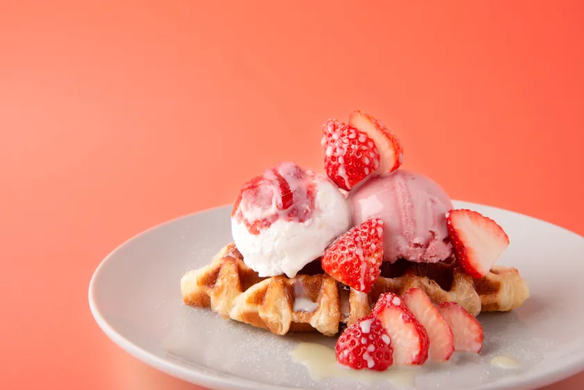 あつあつに焼き上げたクロッフルの上に、ひんやりストロベリージェラートと、フレッシュ苺が贅沢に乗った旬の今だけの特別なクロッフルです。