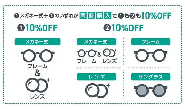 メガネ2本同時購入で10%OFF!2本目以降はフレームのみ・レンズのみ・サングラスも10%OFFの対象となります。※レンズは2枚1組です。