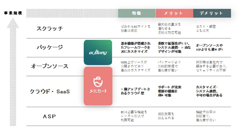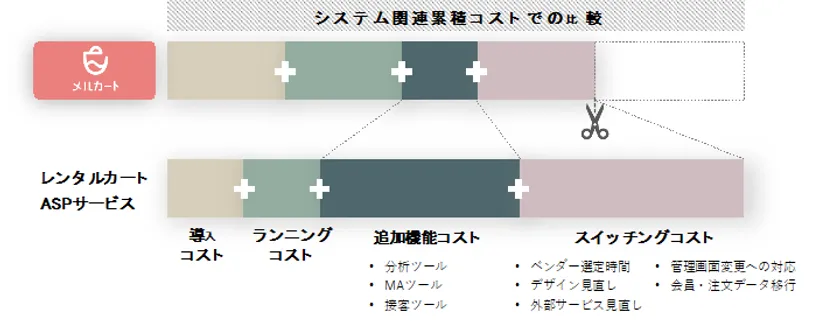 また、長期視点での事業拡大には、機能豊富なプラットフォーム変更が有効です。ASPサービスからの変更は手間・コストともに後負荷となり、メルカートはコスト面での強みもあります。