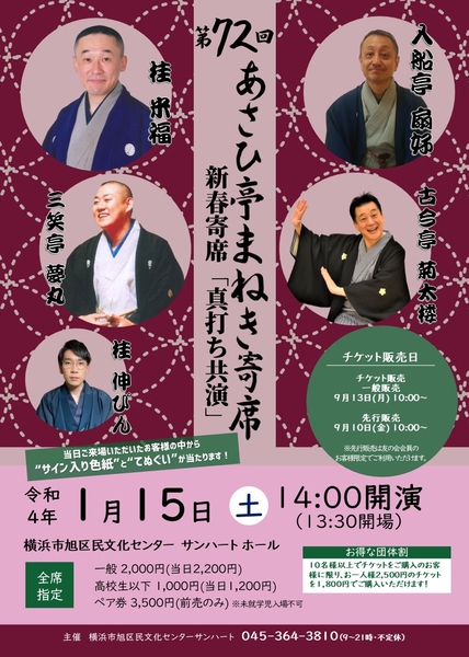横浜市旭区民文化センター サンハート 新春寄席「真打ち共演」『第72回あさひ亭まねき寄席』が2022年1月15日(土) に横浜市旭区民文化センター サンハート ホール(神奈川県横浜市)にて開催されます。チケットはカンフェティ(運営:ロングランプランニング株式会社、東京都新宿区、代表取締役:榑松 ⼤剛)にて発売中です。