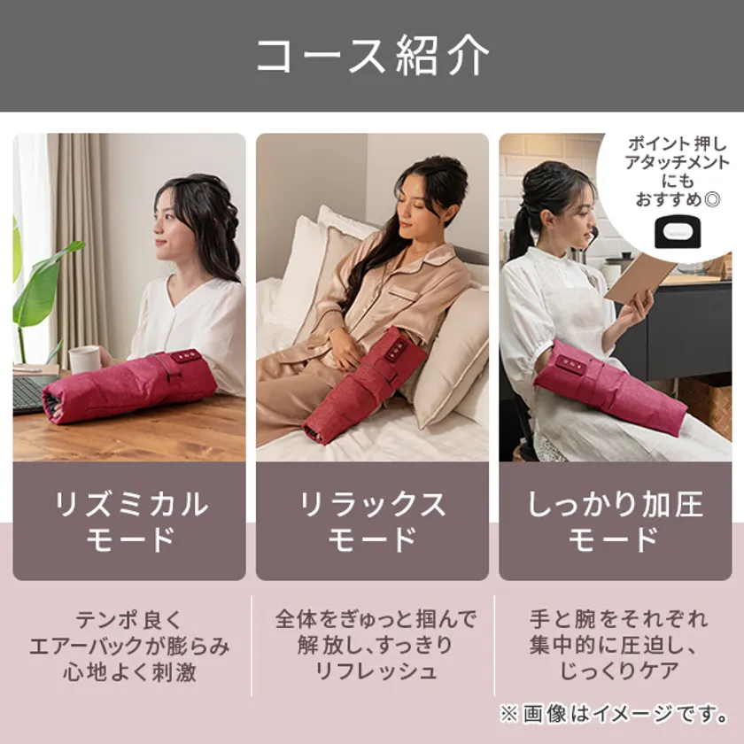 更にポイント押しアタッチメントを付属。手のひらのお好みの場所をピンポイントでぐぐっと刺激し、手のひらから手首、腕まですっきりケアします。