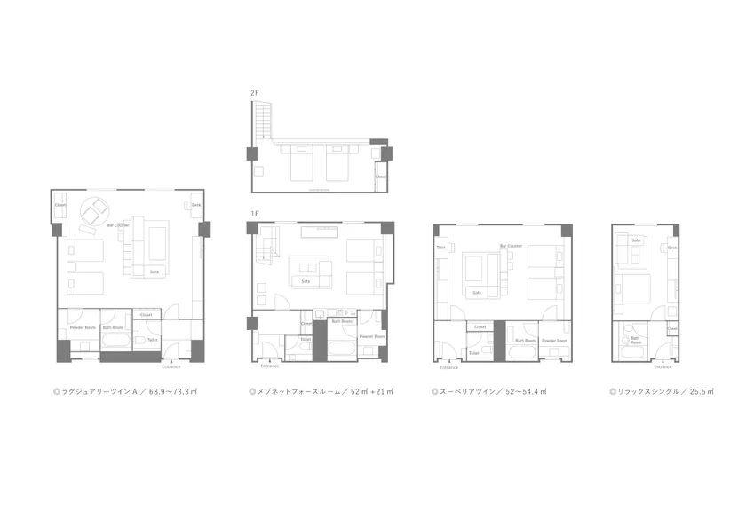 客室は2部屋を1部屋へと改修して居住性を高め、ツインルームで52m2~73m2とゆとりの広さを確保。入口で靴を脱ぐスタイルで、まるでご自宅のようにお寛ぎいただけます。メゾネットタイプやミニキッチン付きの客室、ニーズが高まっているラグジュアリーなシングルルームなど目的別に選べる多彩なお部屋をご用意しました。インテリアには高品質で環境にも配慮した、地元の旭川家具を使用しています。