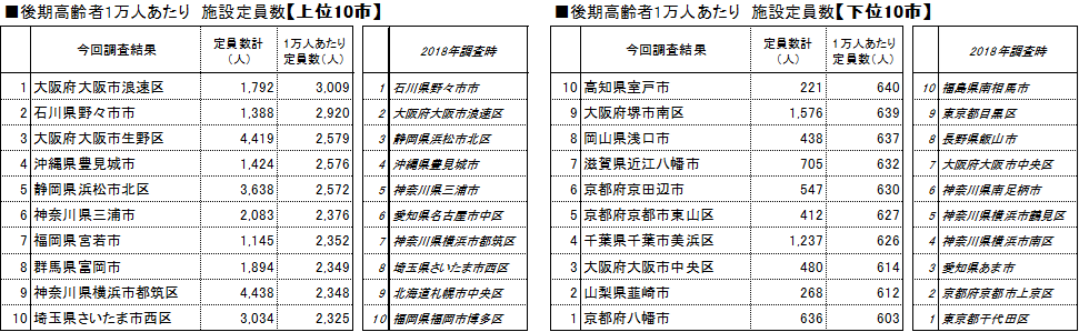 ~ビッグデータで見る 「全国970市区部 高齢者1万人あたりの施設定員数」~ 上位の大阪市浪速区、石川県野々市市は3年前と変わらず 下位10市区は大きく変動し、最下位は京都府八幡市