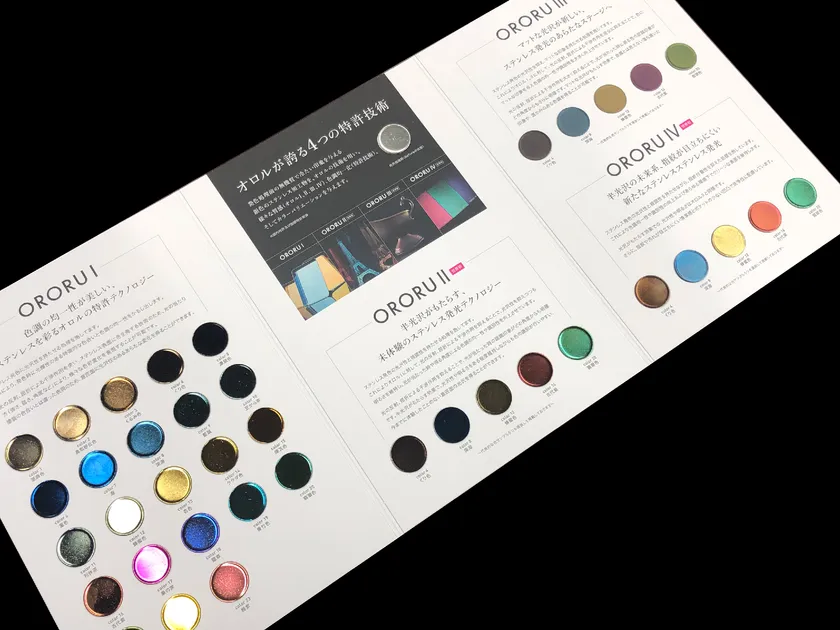 オロル株式会社(本社:鳥取県鳥取市、代表取締役:木下 淳之)は、世界初の技術で色調の均一化に成功し、ステンレス鋼を23色の色で美しく表現するORORU(R)のステンレス発色技術を施した新しい色見本「ORORU見本帳」をリニューアルし、令和4年2月15日に提供を開始いたします。