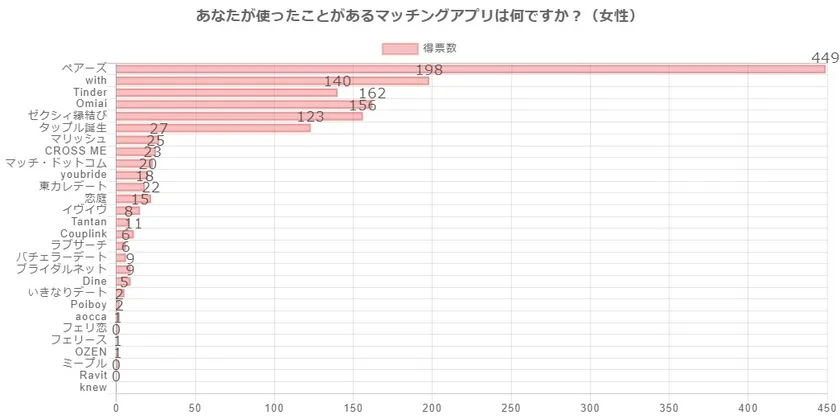 2位以下では「Tinder」は男性人気が女性に比べて高く、「with」や「ゼクシィ縁結び」は女性人気が男性に比べて高いことが判る。また「恋庭」はアンケートでの利用者が少なかったが、1番おすすめと回答する女性が多かった。